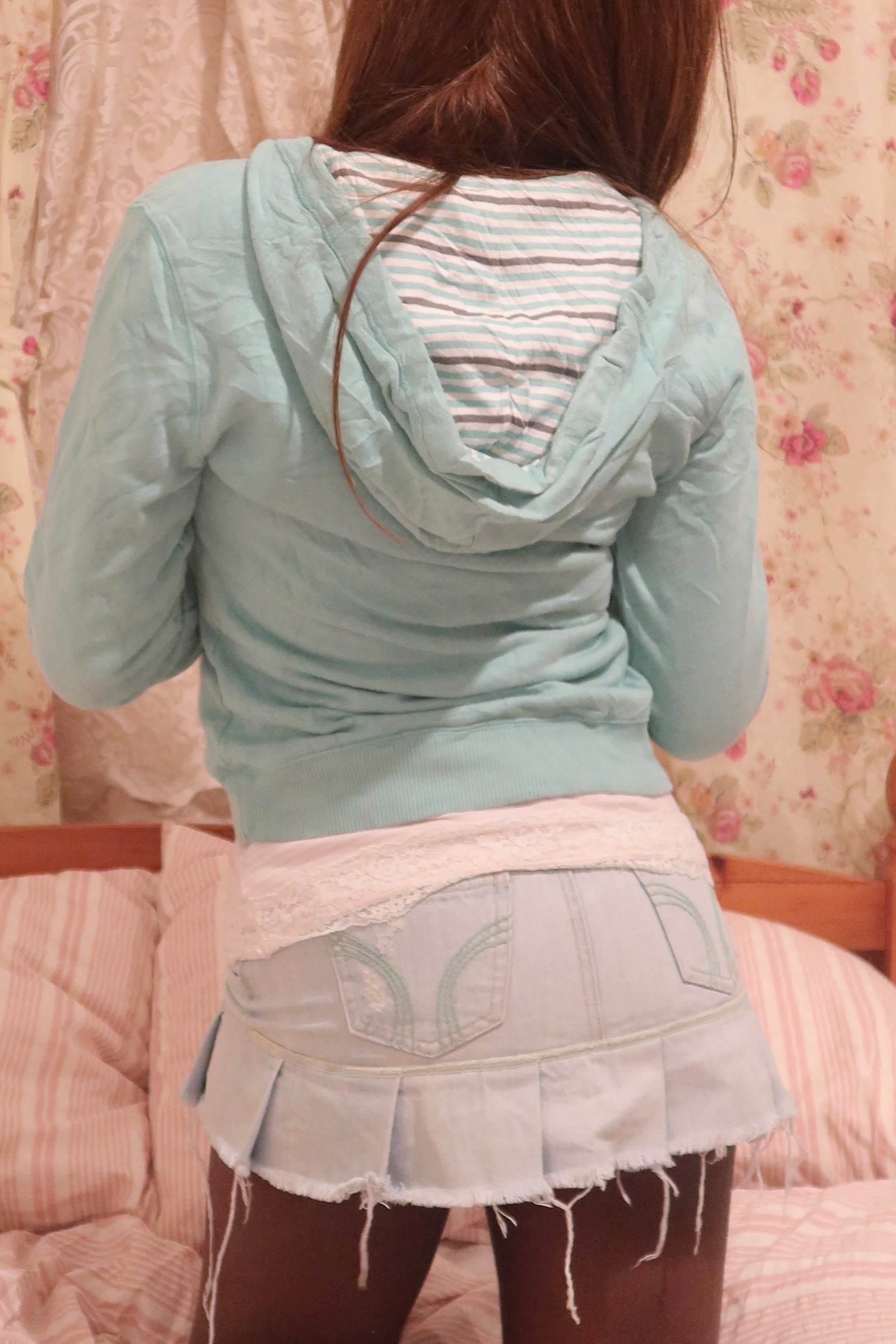 ✿ description:– soft turquoise fabric, embroidered logo, striped hoodie lining