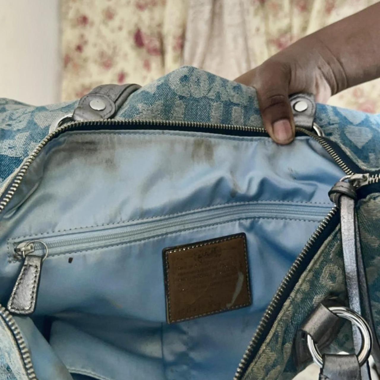 ✿ description: blue denim coach poppy tote with all-over logo print + sturdy double handles, perfect for everyday.