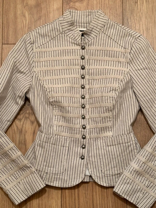 ✿ description: chic principles striped jacket w/ structured military buttons + corset-style seams ♡